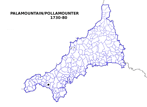 While there were no other examples in West Penwith after 1577, the surname, usually spelt Pollamounter, flourished at St Columb Minor and nearby parishes from the 1570s. The spelling Pollamonten first appeared in the Breage parish register in west Cornwall in 1641. It established itself there during the 1700s while Pollamounter remained the spelling in mid-Cornwall. It looks likely that Palamountain was a specific spelling variant emerging at Breage, although whether the Palamountains were originally Pollamounters from the east or Polmanters from West Penwith remains open to question. Family history is required to prove a link.