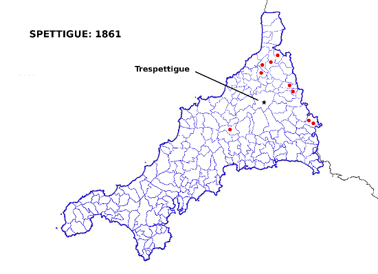 Spettigue was first found as Spetego in North Tamerton, on the border with Devon. After the mid-1500s it spread from there to other parts of north-east Cornwall, where it was still most common in 1861. Meanwhile the name had mutated from Spetego to Spettigue by the 1580s as it moved out of North Tamerton. But it has an earlier history. Despite its location it’s from a Cornish placename – Trespettigue in Altarnun. It had presumably migrated eastwards from there between the 1300s and 1500s. Trespettigue was found as Trespethegou in 1401 and Rospethigou in 1332. Ros means a moor but spethegou or pethegou is less clear. Could it be from spethas – brambles, meaning something like moor of the little bramble patches?