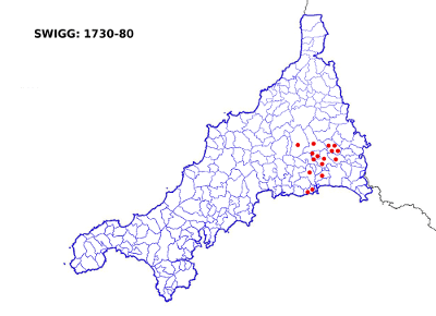 The verb ‘to swig’ is now associated with drinking. This has been suggested as the origin of the surname Swiggs, which could either be a nickname or an occupational name for someone who made drinking vessels. But that’s all guesswork. What is less conjectural is its Cornish geography. The name, as Swigg, had emerged in the Menheniot district, near Liskeard, by the mid-1500s. It didn’t spread far, however. In the eighteenth century Swiggs were still focused on the same district. Apart from the occasional example, Swigg obtained its -s relatively late, for most families after the mid-1700s.