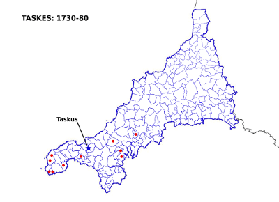 Somewhat more mysterious at first glance is the surname Taskes. However, this also probably stemmed from a placename. By 1861 this family name was entirely restricted to West Penwith. But in the eighteenth century some families named Taskes had been found as far east as Truro and Falmouth. There were no Taskes listed in the 1641 Protestation returns but in the 1570s and 1580s we find the name in parish registers at Sancreed and Madron in the west. The most likely origin is the place now called Taskus at Gwinear, not that far to the east. This was spelt Talscus in 1317 and means a shady hill-brow.