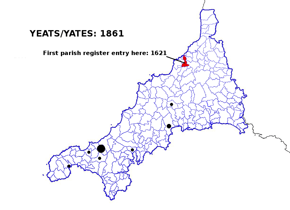 The first record I can find of the name Yeats is the burial of Arthur Yates at Boscastle in north Cornwall in 1627. From there this surname, more likely to be spelt Yeats in Cornwall than Yates, had by the mid-1700s dispersed to mid and west Cornwall. Over half the Yeats households were then found in the Wadebridge district of mid-Cornwall. By 1861 however, it had ramified in Camborne, a reflection of the population expansion there caused by the mining boom. As a result, the centre of gravity of the name in Cornwall shifted even further west.