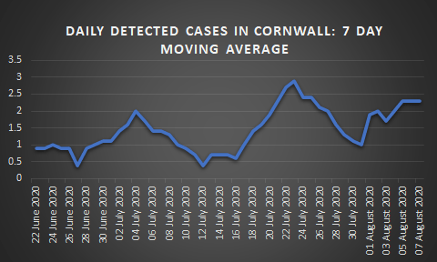 As the number of cases of Covid-19 in the UK creep up again as preventive measures gradually ease, nerves have started to jangle. It’s time therefore for an update on the situation in Cornwall. (For the first blog on this in June see here.) The most recent release of data on the number of detected cases has shown an ominous jump in the number in Cornwall from nine in the week ending August 2nd to 16 in that ending on August 9th.