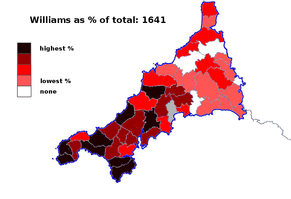 In the Protestation returns of 1641 we find the name Williams or William in most parishes across Cornwall. But, as the Cornish-speaking communities often adopted hereditary surnames up to 200 years after English-speaking east Cornwall, we should expect to find that the proportions of Williamses were far higher in the west. And they were. The highest incidence was at St Buryan, as far west as you can go. There, almost seven per cent of adult men had the surname William or Williams. In most of Cornwall east of Bodmin it was just one per cent and usually far lower.