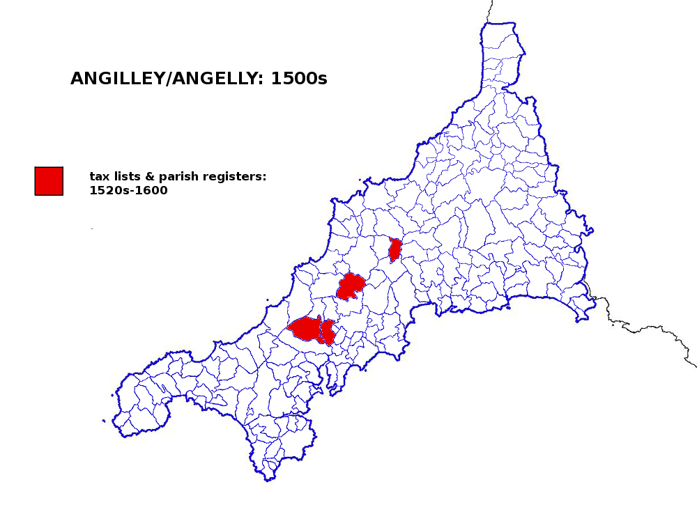 From this point on in my weekly surname blogs, I intend to work through the names in The Surnames of Cornwall, providing maps of their distribution in the sixteenth century, if not already covered in previous blogs. I’ll deal with one to four surnames (depending on their frequency) in each blog. If such maps already exist for the name I’ll give the link to the relevant blog.