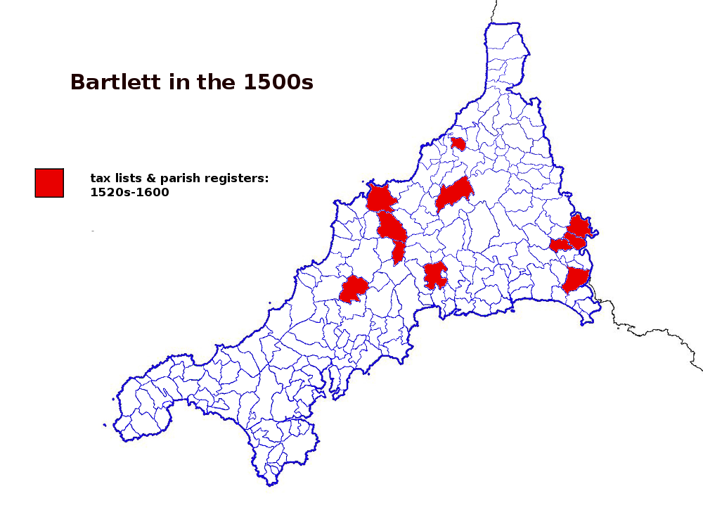 Around the same time, in the latter part of the 1500s, the form Bartla also turned up. This was restricted to St Enoder parish in mid-Cornwall and at first glance looks like a development of the name Bartle as it moved eastwards.