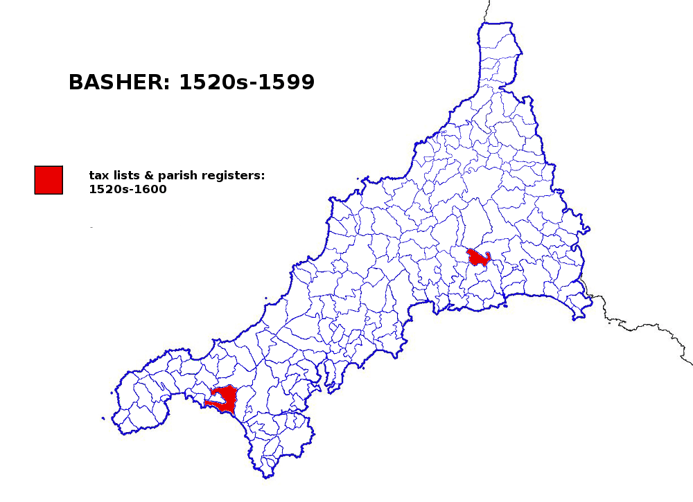 The most obscure is Basher. Only two examples are found in the 1500s, and these widely seperated. There is also a possible Annis Bashe at Sancreed in West Penwith in 1582 although the reading is unclear. To deepen the mystery further it then disappears for over a century before popping up again on the Lizard.