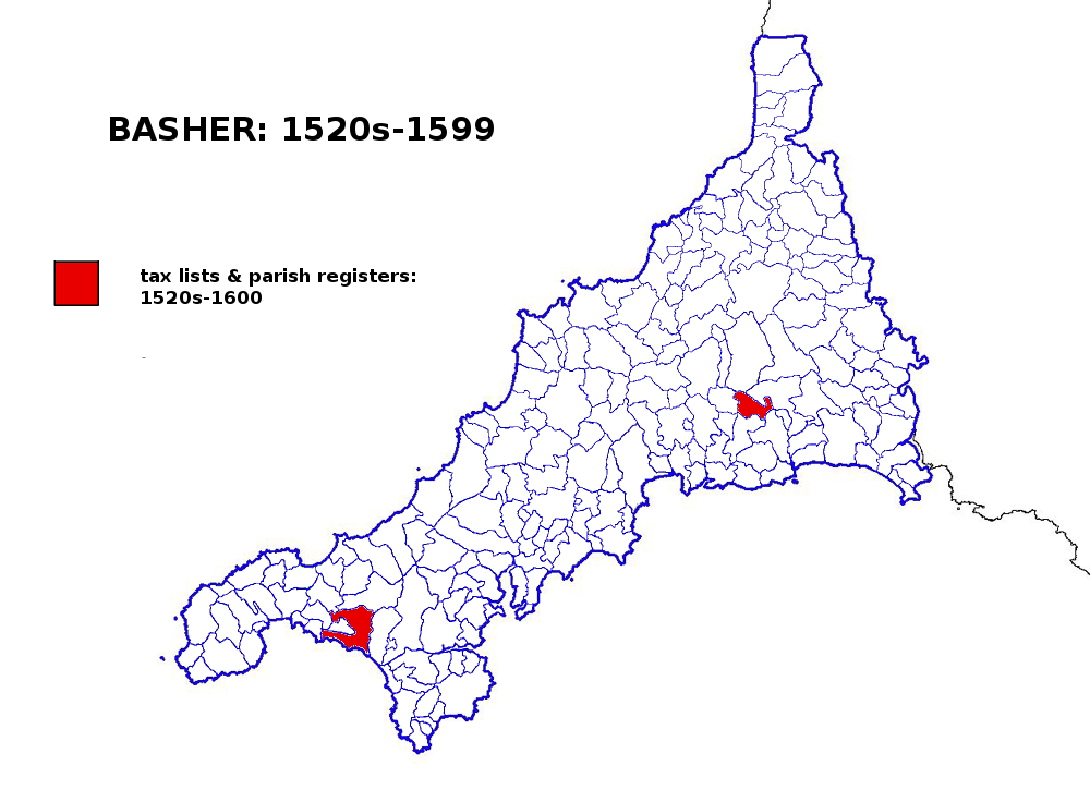 The most obscure is Basher. Only two examples are found in the 1500s, and these widely seperated. There is also a possible Annis Bashe at Sancreed in West Penwith in 1582 although the reading is unclear. To deepen the mystery further it then disappears for over a century before popping up again on the Lizard.