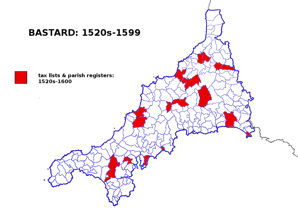 Of the three names below Bastard most obviously originated in a nickname. As might be expected, it was found over a wide area in the 1500s.