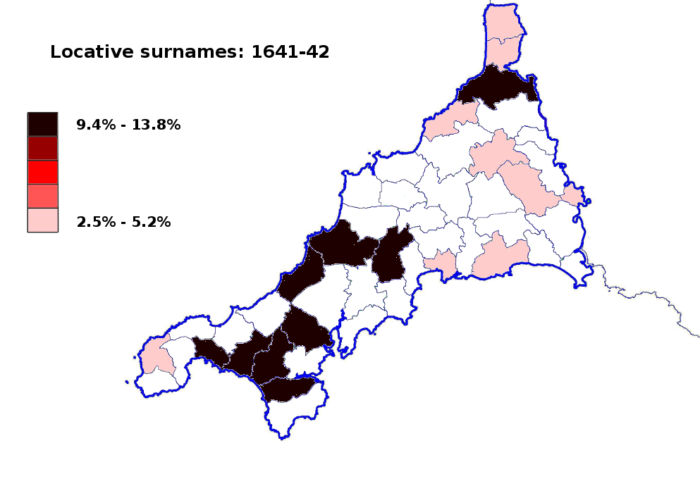 Recently I returned to this topic, approaching it in a more organised way. I took all the surnames that I identified in The Surnames of Cornwall as definitely deriving from placenames and totted up their numbers in the Protestation Lists of 1641/42. The result is not as clear cut as I had expected.