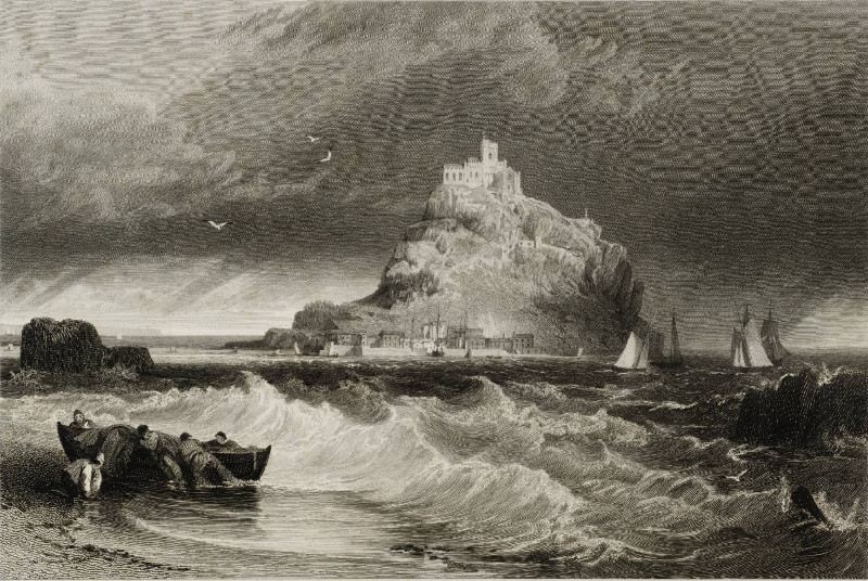 In 1792 James Boswell, on a trip to Cornwall, made the obligatory visit to St Michael’s Mount. He was less than impressed, complaining that ‘it is a disgusting nuisance to have a parcel of low, dirty people collected there’ (in the village at its foot), with ‘a vile smell of spoiled fish and garbage lying about it’. Most visitors however took a longer perspective, admiring the Mount from a distance. The low, dirty people have, one assumes, gone, as have the rotting fish, while the garbage is now plastic. Also gone are the religious and military roles that the Mount once had.
