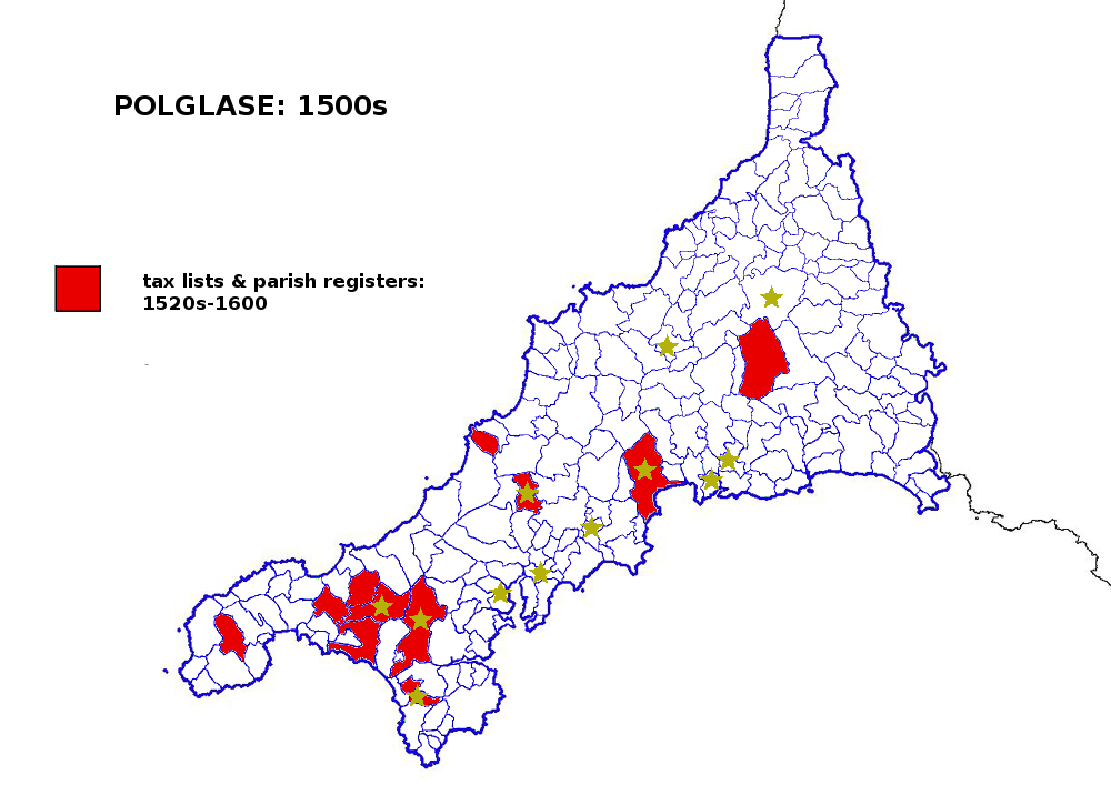 But if we look at the picture in the 1500s and add the placenames back to the map we can see that at least half of the places had in fact given rise to surnames, those on the Roseland seemingly being the exception. Although the parish of Breage did not have this placename, the surname was presumably introduced there from the nearby parishes of Crowan and Wendron, and then multiplied the most vigorously, producing the western bias of later centuries.