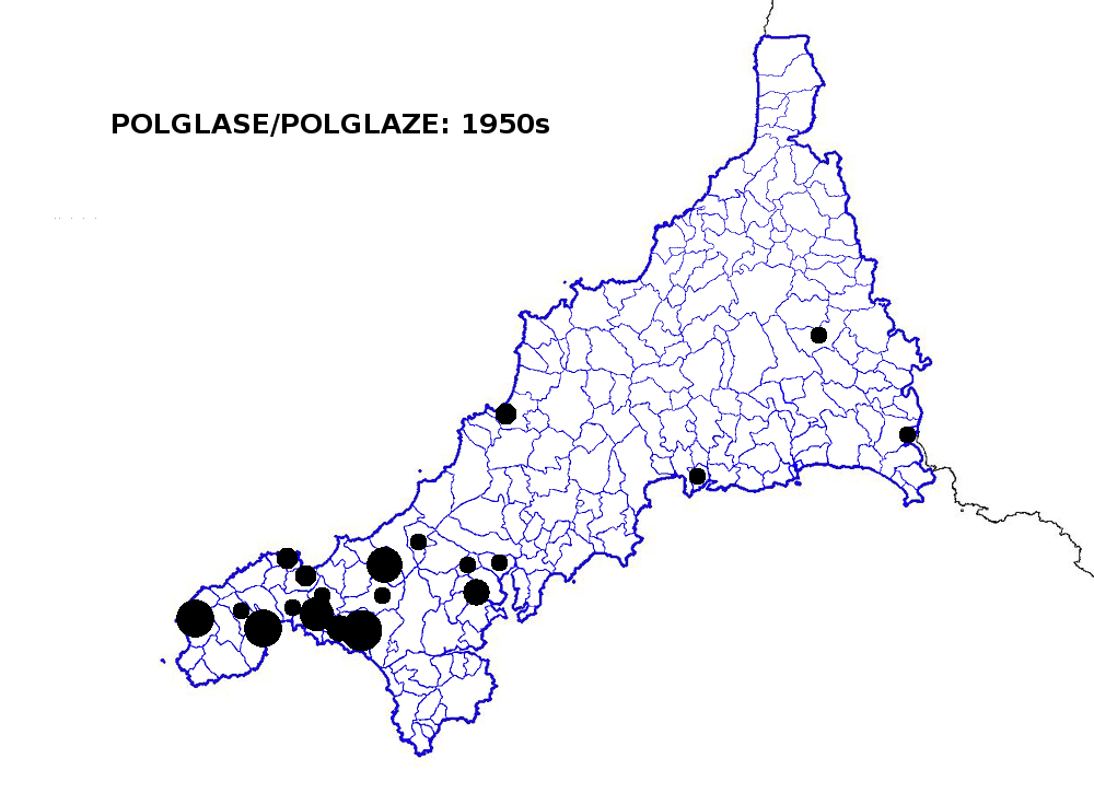 Although the placenames are quite widely distributed, by the 1950s two thirds of those named Polglaze were found in the far west, with the largest number living in the parish of Breage. Given this pattern, we might think the origin of the surname lay in the far west and then spread out from there. Did it?