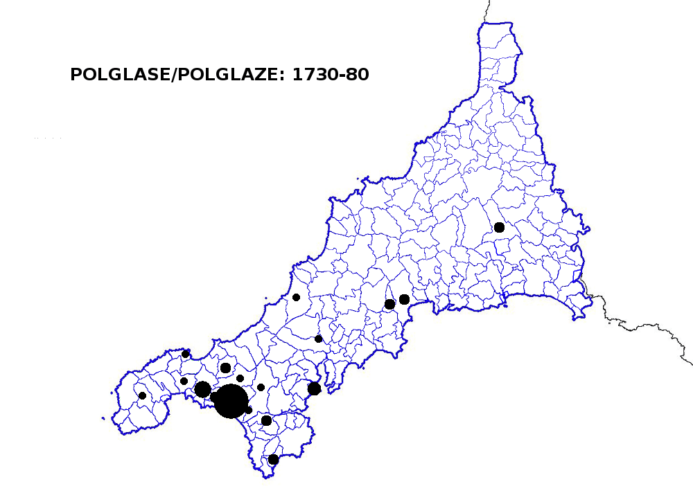 In the 18th century and in 1861 the picture was similar, with the majority of Polglase households living between Penzance and Helston. At both periods by far the greatest number were found in Breage.