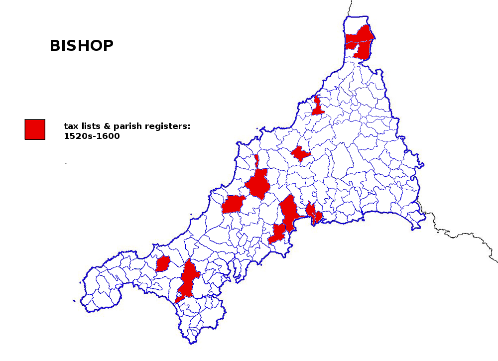 Here’s the distribution of two such names – Knight and Bishop – in sixteenth century Cornwall. They were both widespread by this time. However, as we might expect, there’s a hint, certainly for Knight at least, that fewer were found in the Cornish-speaking west. In any case, here there were Cornish language equivalents – Marrack and Epscop – no doubt often suffering the indignity of being translated when written down.