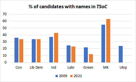 Not surprisingly, given their alternative title of The Party of Cornwall, we might expect MK to have a proportion more closely approaching that of 1889. However, the low number of candidates this year makes the figure for 2021 subject to a very large sampling error. And even among their candidates the number who share the entries in The Surnames of Cornwall is significantly lower than in their great-grandparents’ time.