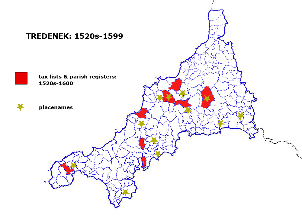 This raises an interesting further question. Why did some common placenames (such as Tredinnick, with about a dozen instances) give rise to relatively few surnames? Was it just luck, down to the survival of family lines in the medieval period? Or was it something to do with Cornwall’s geography or its linguistic history?