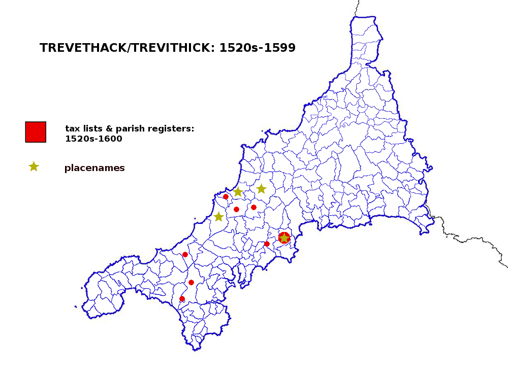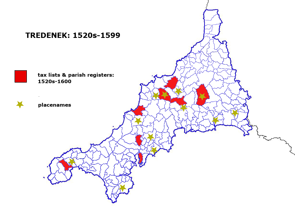 This raises an interesting further question. Why did some common placenames (such as Tredinnick, with about a dozen instances) give rise to relatively few surnames? Was it just luck, down to the survival of family lines in the medieval period? Or was it something to do with Cornwall’s geography or its linguistic history?