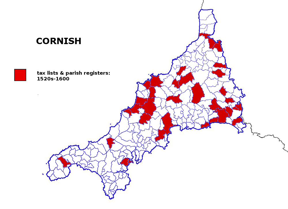 The name was mainly based in eastern parts, in the English-speaking area of Cornwall, although significant clusters were also found in mid-Cornwall around St Austell and St Columb and the odd parish register entry even further west. Its eastern bias suggests first that this second name had become hereditary at an earlier point, probably well before 1400. Second, it may have originated at a time when the Cornish language was on its last legs in the east and when the nickname Cornish (in English note) for someone who was still speaking Cornish had become a useful discriminator. Alternatively, or in addition, it could have been a nickname given to someone with pronounced ‘Cornish’ characteristics, whatever they were at the time.