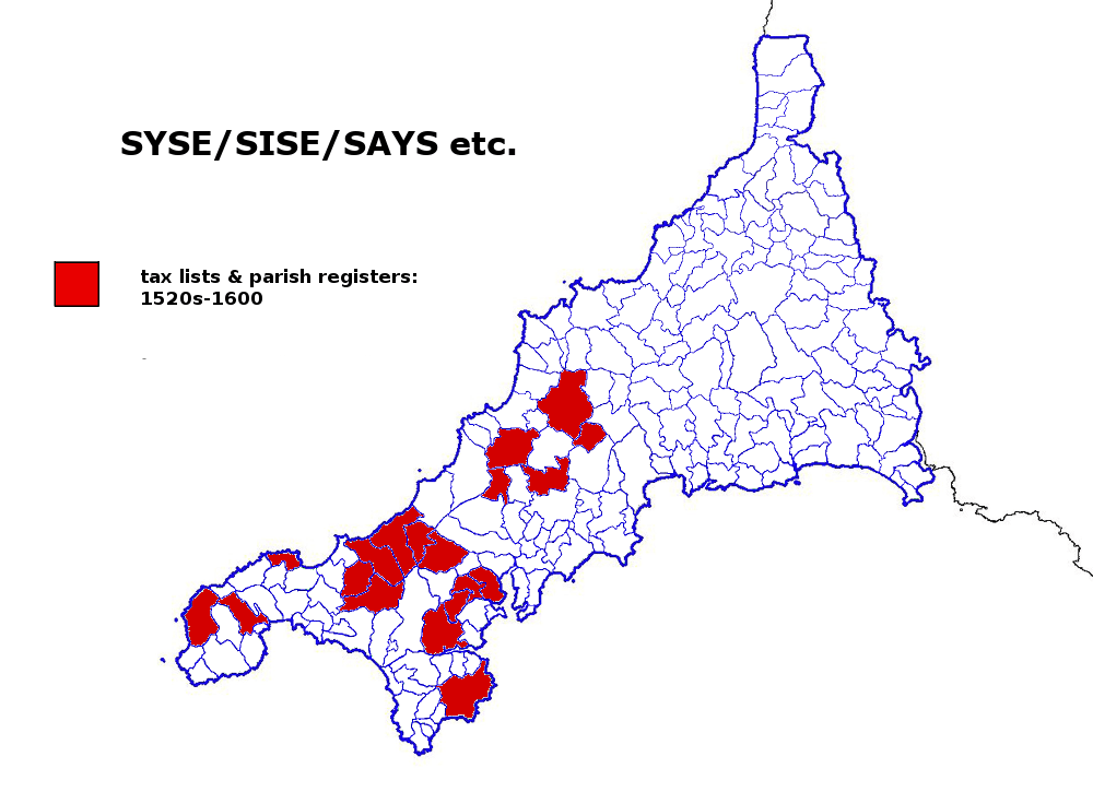 Perhaps Syse was not in the 1500s a fixed, permanent surname, but more like the appellation Briton/Breton, Frenchman or Irish given to migrants from overseas. Evidence for this might be the sharply reduced number with this name in the mid-1600s. By 1641/42 there were just six men named Sise/Size/Sayse in Cornwall. Contrast that with the 63 named Cornish. Sise/Size survived, but only just, in contrast to the English name Cornish, which flourished, a metaphor with wider implications perhaps.