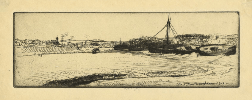 Donald Shaw MacLaughlan (1876-1938) was an American artist (although born in Prince Edward Island, Canada). As a young man he followed the trail of many other artists from North America and travelled to Europe, basing himself thereafter mainly in France but travelling widely. Among his journeys he visited Cornwall, where he spent some time around 1919. He was best known for his etchings of Venice: less well-known are his etchings of various views between St Ives Bay and Camborne.