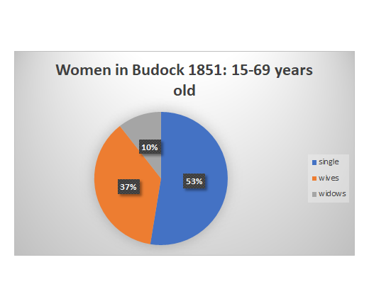 Women well outnumbered men; for every four men of working age there were six women. Just over a third of those women were wives busy running the household. Another 11 per cent were widows, But over half (52 per cent) were single, unmarried women. Of the 40 per cent of women who had a paid employment in the census, six out of ten were servants, attracted to the middle-class streets of north Falmouth.