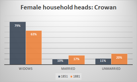 Things had changed by 1881. There was a disproportionate growth in the number of households headed by women, now amounting to a third of the total. The proportion of widows had fallen and both unmarried and married heads risen. The 35 married heads included four whose husbands were stated to be ‘abroad’, one ‘away in America’ and one a ‘gold miner’s wife’. Another eight were described as miners’ wives. The ages of the married heads were again quite high, at an average of 41, with only two under 30. This no doubt reflects the greater ability or willingness of young married women to migrate, while the additional presence of children made this option less likely.
