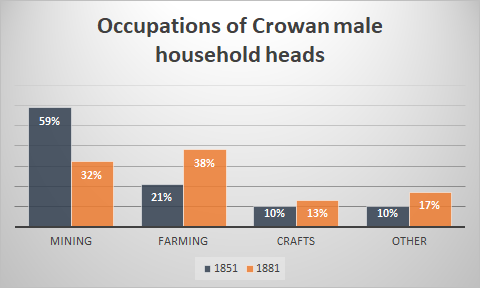 In the early nineteenth century Crowan was a booming mining parish. Its population rose from just under 2,600 in 1801 to peak at over 4,600 in the mid-1840s. Well over half of the households with a male head were working in or on the mines in 1851. While the slumps of the later 1860s and the mid-1870s had reduced this by 1881, about a third of the male household heads were still employed in the mines in 1881.