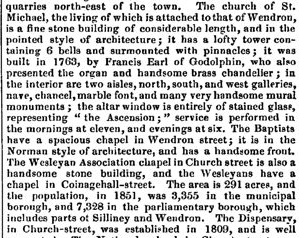 Religion played an inescapable part in the lives of the Cornish of the Victorian period. By modern standards attendance at church or, more usually, chapel was incredibly high, although contemporaries were appalled that only around a half of adults attended church in 1851 when there was a religious census. A wealth of social events were organised by the churches and the Sunday Schools fulfilled a wider role at a time when schooling was neither free nor universally available. Helston was no exception, with a ’very handsome’ Baptist chapel, a Wesleyan and a Wesleyan Methodist Association (later United Methodist Free Church) chapel gracing its streets, in addition to the Anglican church.