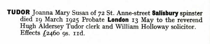 Three of Joanna’s younger brothers eventually joined the family business and became Anglican clergymen. Meanwhile Richard Tudor became vicar of Frampton in Dorset and the family left Helston before 1866 after only a short stay. After a spell in Dorset Richard was then appointed vicar at Swallowcliffe in Wiltshire in the 1870s. He died in 1882 and his wife followed him to the grave in 1889. Joanna, who had not married, was left with her youngest sister Katherine living at St Ann Street, Salisbury for the remaining 36 years of her life. As a footnote a servant, Jane Sydenham, 17 years old in 1871, stayed with the family and then the two sisters for over 40 years until at least 1911.