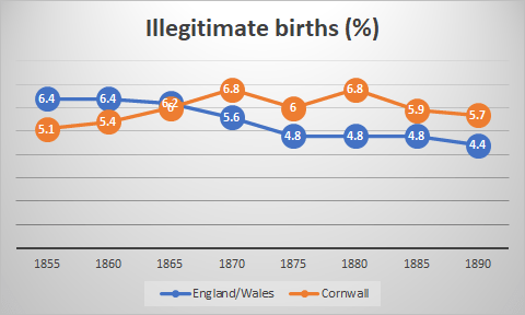 Other social changes accompanied the demographic. For example, the number of illegitimate births in Cornwall had been rising in the early Victorian years. Before the mid-nineteenth century the rate of illegitimate births in Cornwall had been consistently lower than in England and Wales. However, in the 1850s and 60s the gap steadily narrowed. By 1870 the situation had been reversed and illegitimate births in Cornwall were significantly higher than in England and Wales. They peaked around 1880 and began to decline again thereafter.