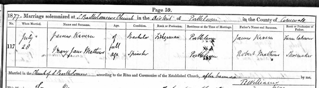 James Kevern had a difficult early life. He was born in the parish of Breage, the son of Ann, with no father named on the baptismal register and at 11 months old was found ‘lodging’ in Ruan Minor with Elizabeth Yendall, or Gendall, possibly Ann’s mother or another relative. At 11 years old he was working and living at a large farm in the parish. In 1871 he was still a farm servant but at another farm in Gunwalloe on the other side of the peninsula.