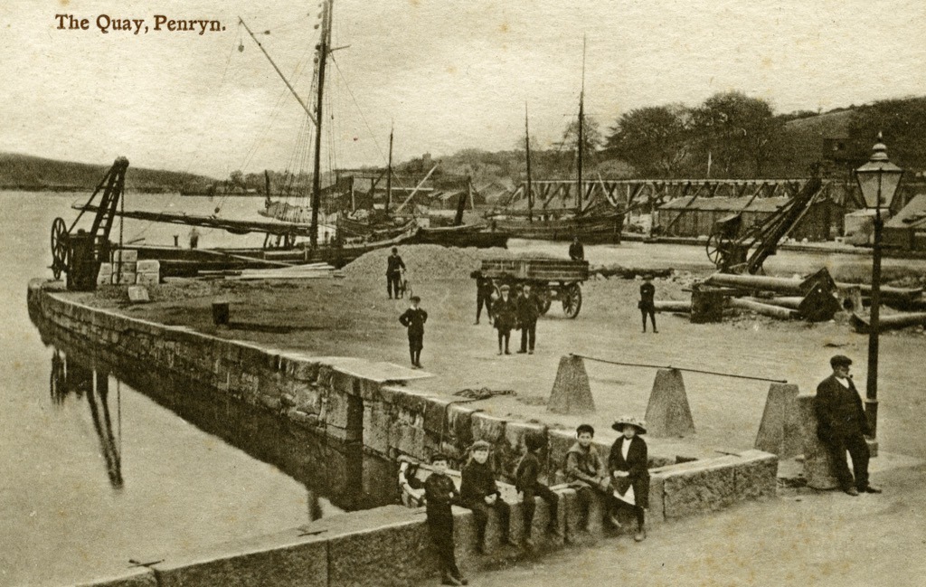 Both photographs show what look to be large families, especially on the right in the upper Penryn image. Ample use of made of “old salts” in both images esp in the top image where the old salt straddles the whole street, almost and surely the photographer placed him directly in the front of the clock tower. There seems to be a really tall man at the back right of the image, too, behind the carriages on the ramp.
