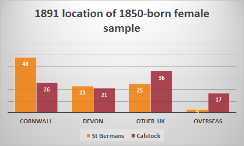 As we can see, this was reflected in major differences in their migration patterns. The St Germans born children of 1850 were more likely to stay in Cornwall or to be found in neighbouring Devon, less likely to make longer-distance moves within the UK and much less likely to have gone overseas. Boys and girls shared this profile, the only difference being that St Germans-born girls were more likely to be found in Devon in middle age than in Cornwall. This reflected the pull of the demand from Plymouth for female labour in this far south-eastern corner of Cornwall.