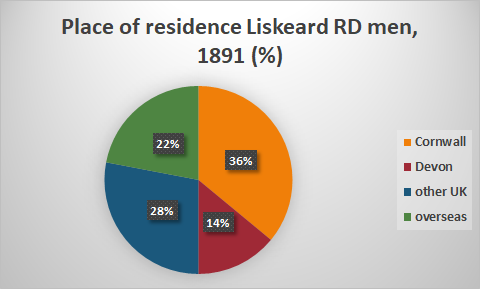 Gender differences were profound in this RD. Almost two thirds of girls born in the Liskeard RD were still found in Cornwall in the 1880s, in contrast to only just over a third of the boys. The proportion of female emigrants was – at less than 10% – very low, lower in fact than from the purely agricultural districts of north Cornwall. Meanwhile, girls were much less likely than boys to have travelled further afield within the British Isles.