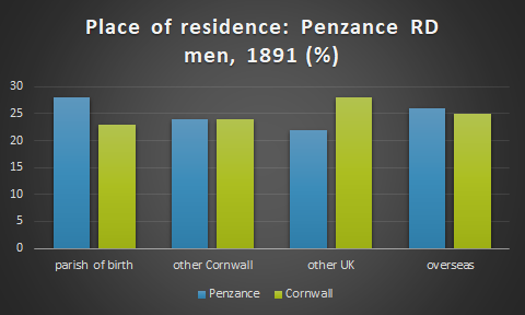 Those born in the mid-nineteenth century in the RD of Penzance turn out to be quite similar to the rest of west Cornwall when it came to the choice of moving or staying. However, the number who were still living in their parish of birth in their 30s and 40s was higher than usual. Over a quarter of men and a third of women from the Penzance RD were still present in their birthplace.