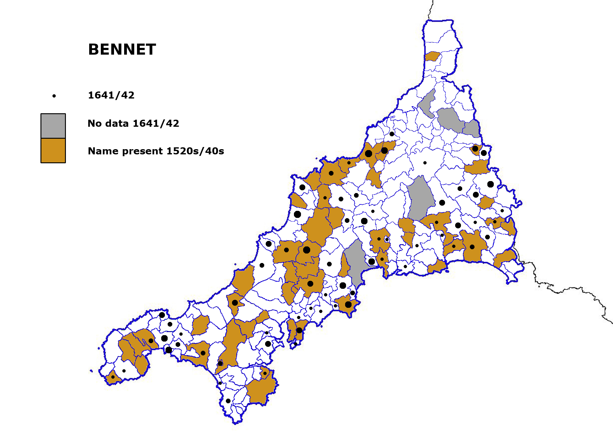 The distribution of the 578 households in Cornwall headed by someone called Bennetts or similar in 1861 would strongly suggest that the surname arose in west Cornwall.