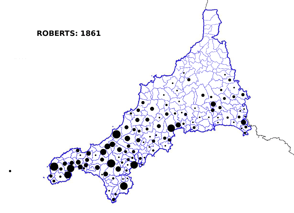 However, by 1861 Roberts had established a presence in that intervening area and across the south of the peninsula although its original geography was still faintly detectable; in particular note the absence of the name in north Cornwall. A healthy growth in the west allowed the 625 households headed by a Roberts to figure in our top ten. Moreover, Robert was one of the first surnames to get its <s>; as early as 1641 over half (57 per cent) were Roberts, not the original Robert.