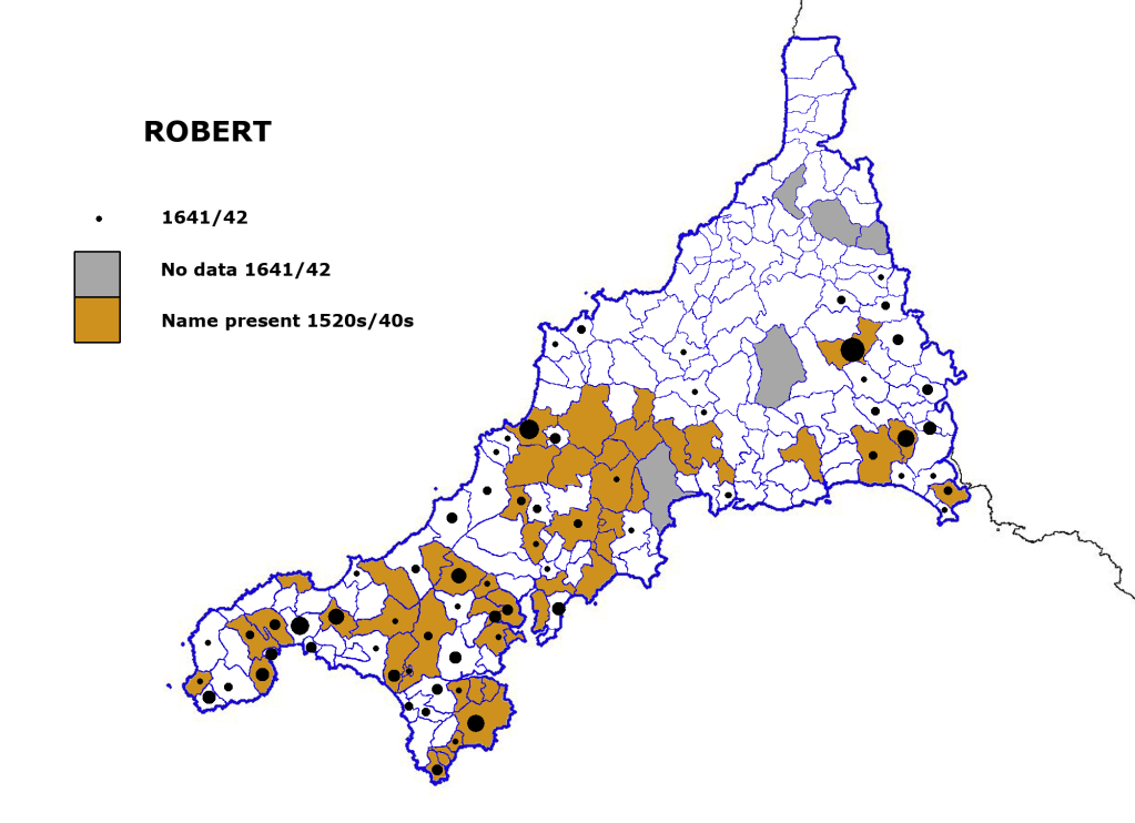 In the 1500s Robert wasn’t as ubiquitous as some other surnames and was almost entirely absent from north Cornwall. Furthermore, its two main locations in south-east and west Cornwall were separated by an area in which Robert was rarely encountered.