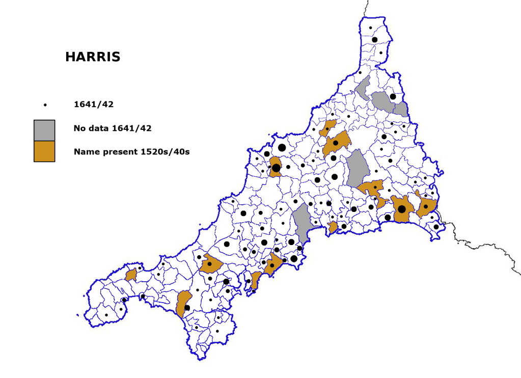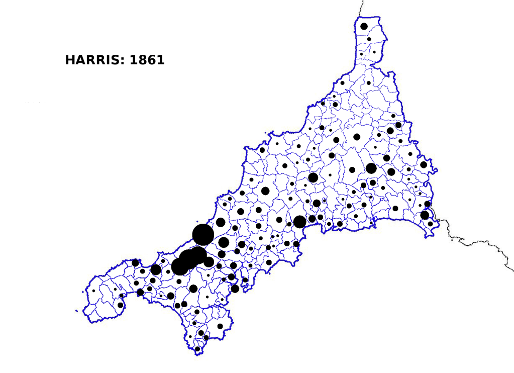 By 1861 the former position had been entirely reversed, with 717 households headed by a Harris and only 114 stubbornly sticking with Harry. In an interesting echo of earlier patterns the more conservative spellings look to have been most favoured in the west, while Harris with an <s> had conquered most of the rest of Cornwall by this point.