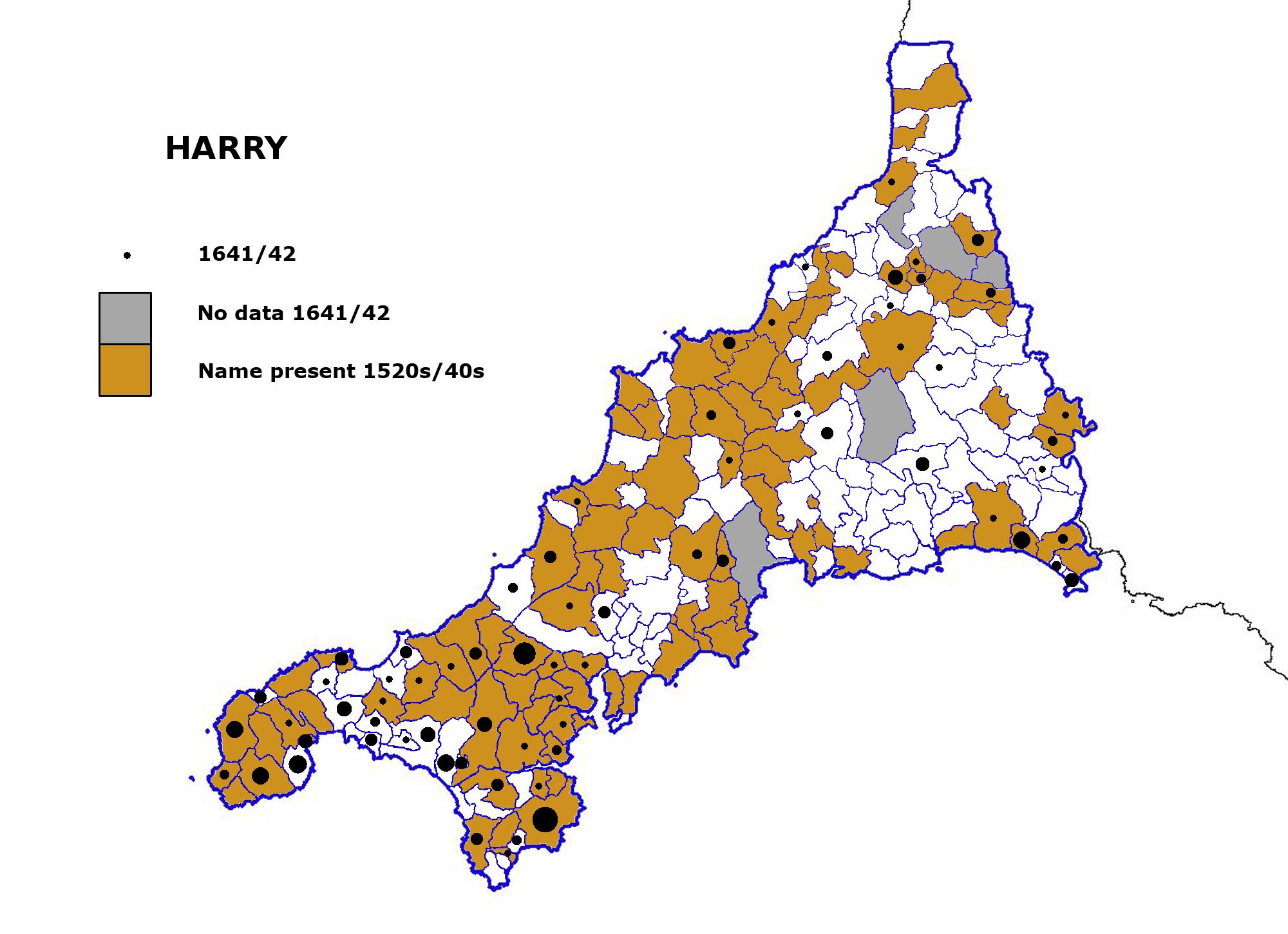Harry, like other first names, was then appropriated as a by-name and eventually a hereditary surname. It was found in most parishes, although less prevalent in south-east Cornwall. At the same time, in a process that has become familiar during the making of this list, Harry was beginning to get its <s> in the 1500s and 1600s.