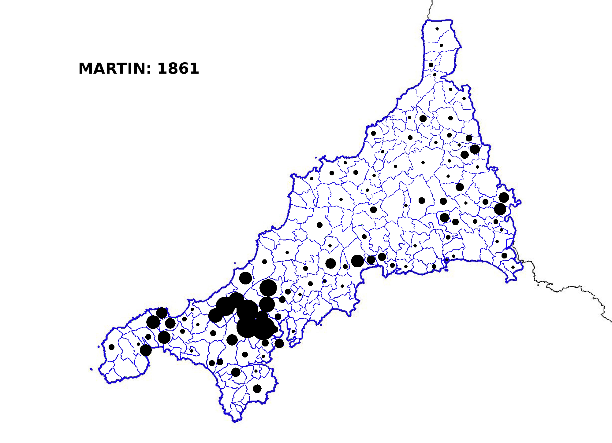 In the 16th century the family name Martin was more evenly spread across Cornwall than many other surnames coined from personal names. Moreover, in 1641 it looks to have been more frequently encountered in the east of Cornwall than the west, indicating that the first name had become a surname at a relatively early stage.