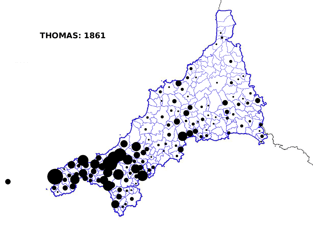However, even more so than Richard, it was present in mid and west Cornwall but only sparsely represented in east Cornwall. Its distribution in the 16th century closely mirrors the cultural divide between Cornish-speaking communities and the English-speaking east where surnames had been hereditary up to 200 years earlier. At that time – in the 1300s – there was more choice in surname formation. By the 1500s that choice had narrowed and names such as Thomas, Richard or Rawe dominated surname formation.