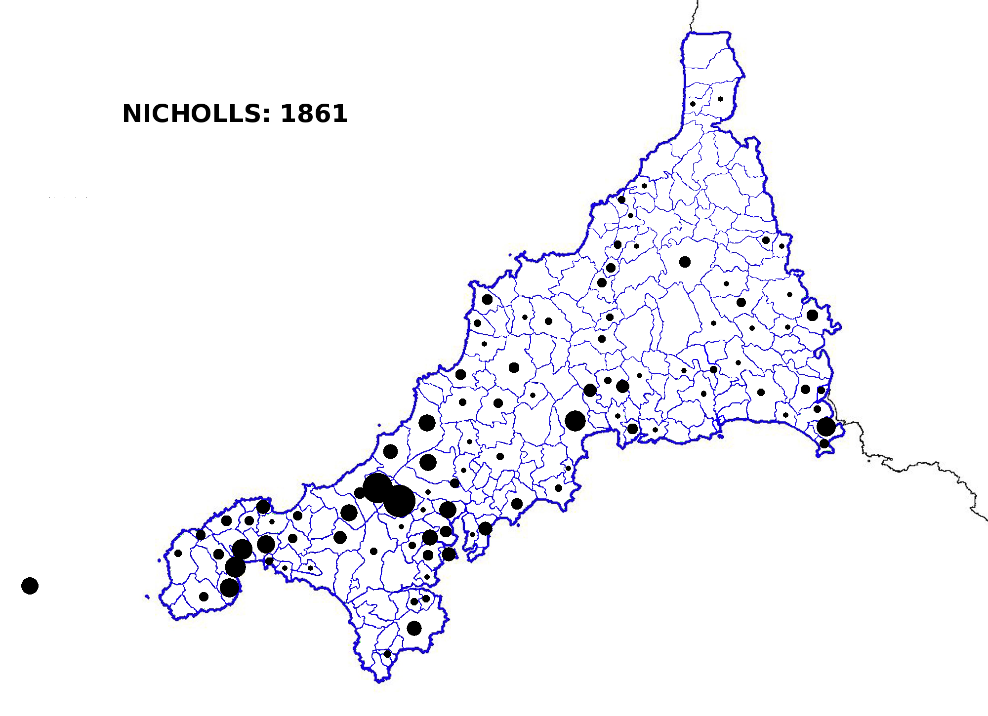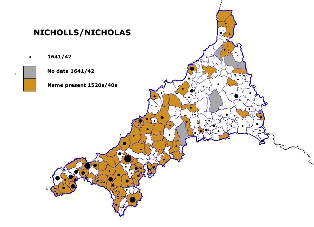In the middle ages Nicholls was the vernacular and common form of the original Greek name Nicholas. Contrasting with James, it was more likely to be encountered in east Cornwall in the 1600s, by which time it had dispersed widely. The distribution of the surname Nicholas shows no particular difference from Nicholls. Its adoption was no doubt more a matter of luck and the predilection of the local literate class than anything else.
