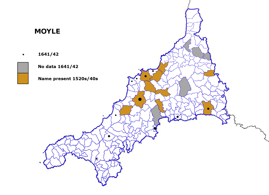 For instance Moyle seems to have multiplied in mid-Cornwall on both sides of the Camel estuary, an interesting distribution given the claim that it was a nickname from the Cornish language word for bald.