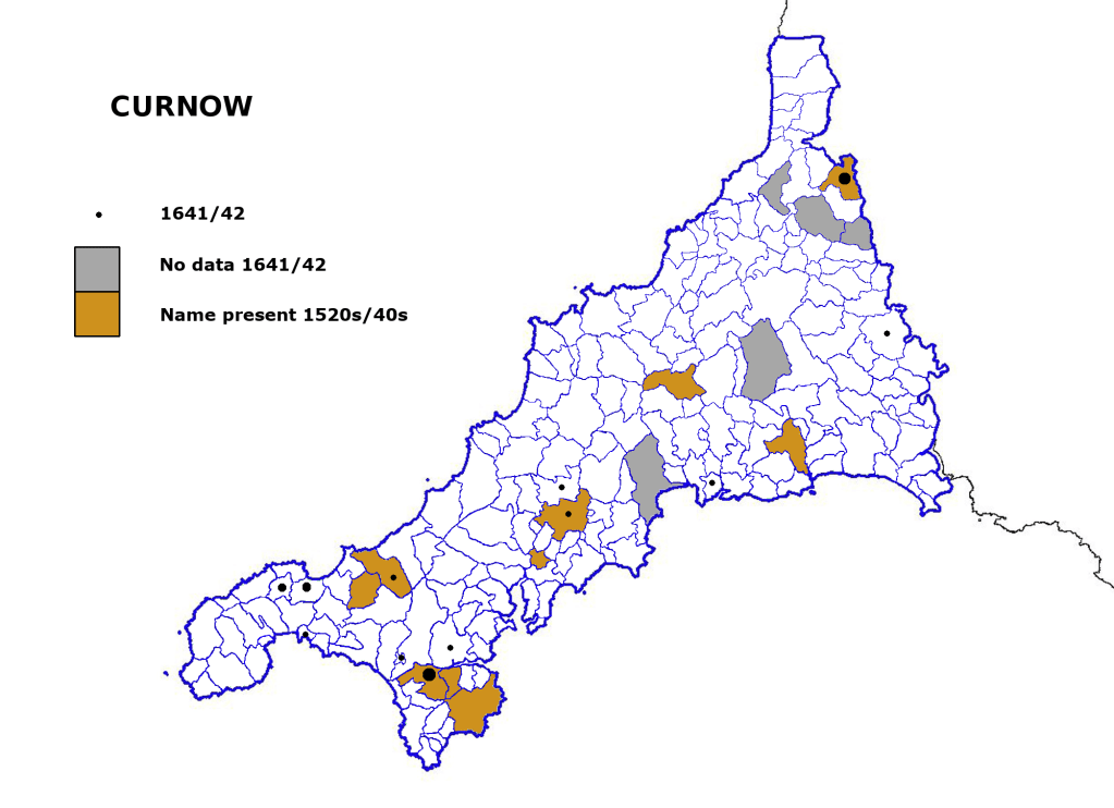 1. Interesting point. But if it was for temporary migrants when were they named and by whom? The naming must logically have occurred outside Cornwall. If named in Cornish when a migrant they themselves must have been the namers. Yet the distribution in the early 1500s shows no obvious correlation with the geography of the language. The spellings bear out the point that Cornow began to be replaced by Curnow in the 1580s.