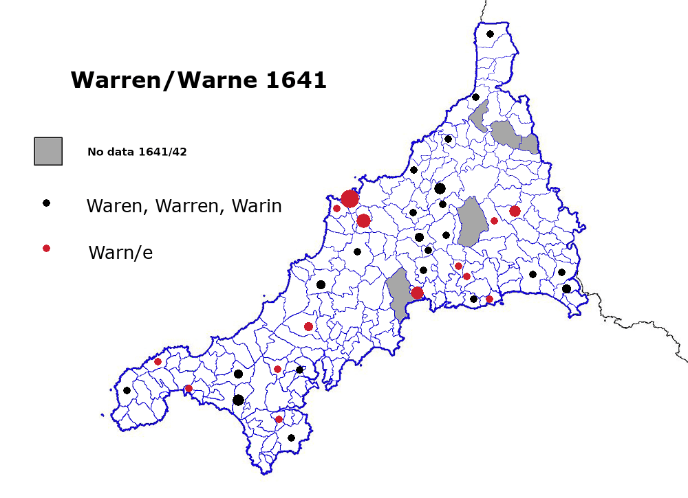 Parish registers in the later 1500s provide several examples where the same person is named in some records as Waren and in others as Warne. For instance John Warne of St Issey is recorded as such in 1596 and 1599 but as John Waren in 1600. It looks as if the names were interchangeable at a time when spelling was erratic, unpredictable and dependent on the whims of clergymen and tax collectors. The 1641 map bears this out, with an intermingling of the names, although Warne was at that time more concentrated on some places than the more evenly spread Warren.