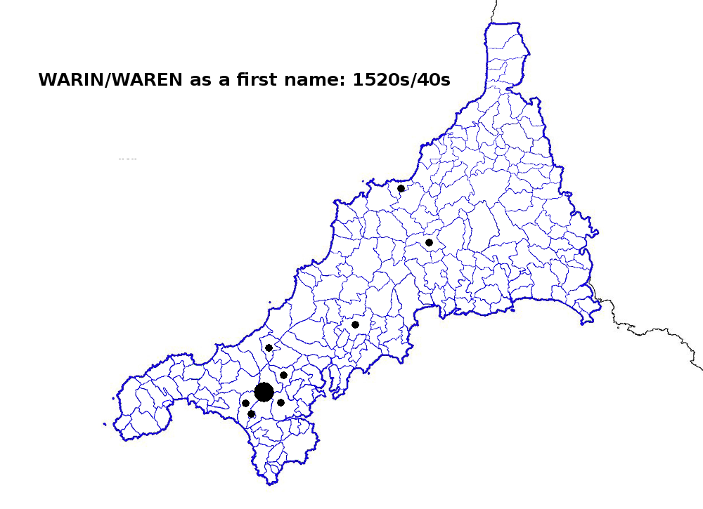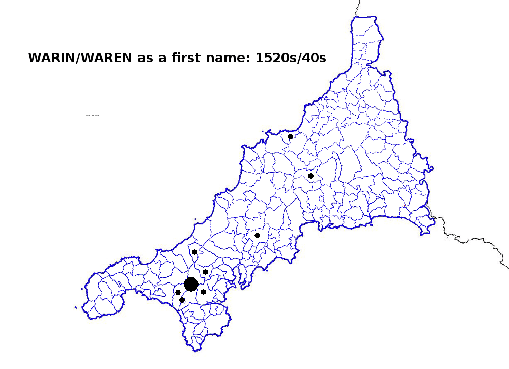 That had reversed itself by 1861 (for maps see here), by which time Warren was more likely to be encountered in the west. As for an origin for these names, that’s more likely to lie in the personal name Waryn or Warin. This first name was still being used in Cornish-speaking west Cornwall in the 1600s but had apparently gone out of fashion in most of the east.