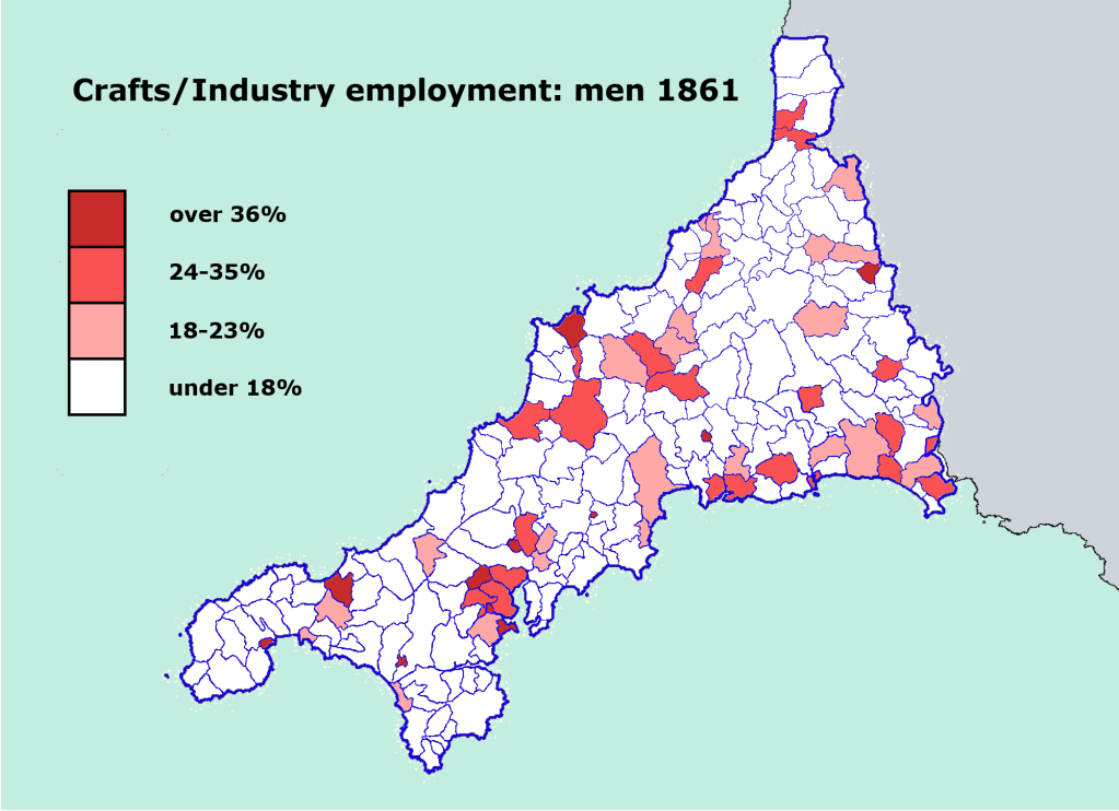 Craftsmen were concentrated in the towns of Cornwall. Helston, Truro and Penryn hosted the most with approaching a half of all men in those towns boasting a craft of some kind. The proportion of men in crafts and industry in some other places reflected the presence of specific industries. Phillack, including most of Hayle, was a centre of engineering as was Perranarworthal; the proportion in manufacturing in Grampound was boosted by local tanneries. Higher percentages in the coastal parishes of south east Cornwall, Padstow or near the Fal estuary reflected concentrations of shipbuilders, accounting for almost 1,000 men, or just over one per cent of Cornwall’s male workforce.