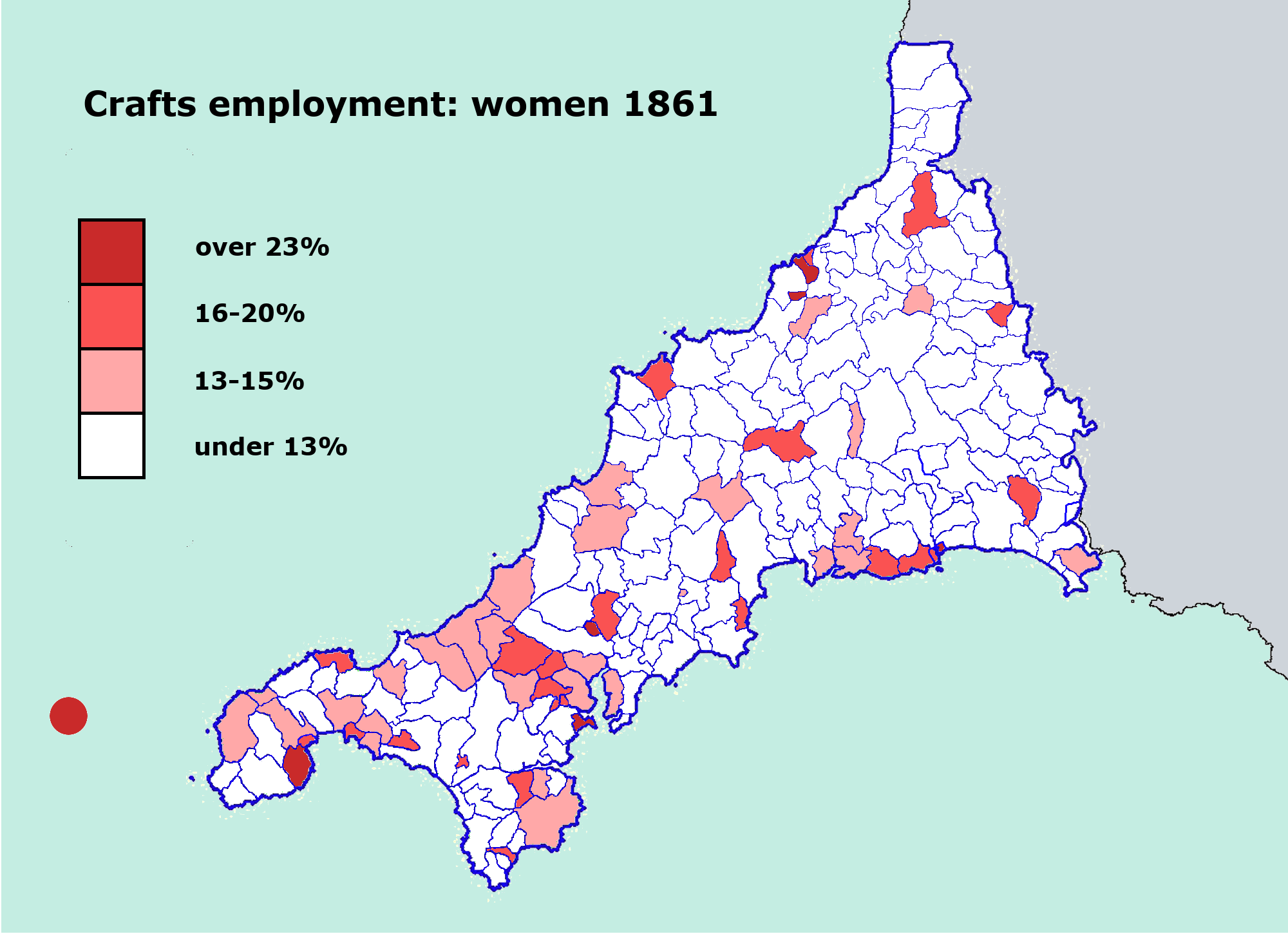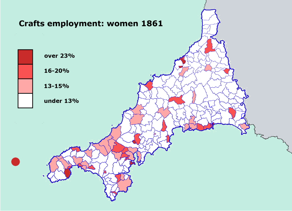 The latter factor helps explain why the highest proportion of women found making things in 1861 was actually on Scilly, while Paul, including the fishing ports of Newlyn and Mousehole, Falmouth and East Looe were also high on the list. These were places where a quarter or so of unmarried women were recorded as engaged in manufacturing, double the average rate.