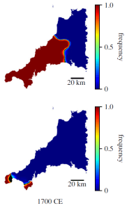 Interestingly, the modellers found that with no bias against Cornish, or pressure to conform, according to their model the language boundary should have remained well to the east of Bodmin as late as 1700, instead of by then being pushed to the margins of the Lizard and West Penwith. As bias against Cornish is increased in the model the historical geography comes to resemble – broadly – what is thought to have actually happened.